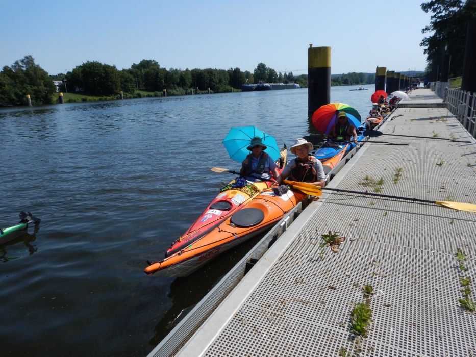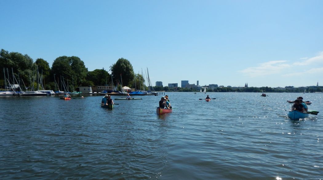 Zum Abschluss der 25. Internationalen Elbefahrt hatten die Hamburger Kanuten noch eine besondere Idee: Für die Teilnehmer war ein Triathlon vorbereitet worden. Start war in Allermöhe mit einer Fahrradtour in die Speicherstadt. Gleich gegenüber von den imposanten Backsteinbauten gab es einen Erfrischungspunkt mit Hafenblick. Nach der Abgabe der Räder wurde zum Bootshaus des Hamburger Kanu Clubs umgesetzt. Dort wurden von den Vereinsmitgliedern erneut Getränke verteilt.Teil 2 des Triathlons bildete eine geführte Canadiertour durch die Alsterkanäle und zurück über die Außenalster zum Bootshaus. Dort wurden dann Franz Brötchen gereicht. Wegen der großen Hitze waren auch die Gertränke sehr willkommen. Den Abschluss des Triathlons bildete eine Power-Walking-Strecke von der S-Bahn Mittlerer Landweg zurück zum Ausgangspunkt beim Olympiastützpunkt..